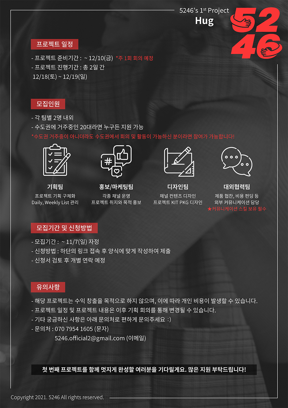 - 'Hug Project'는 다가오는 연말, 그 누구보다 따뜻함이 필요할 사회의 소외된 사람들에게 다양한 방면에서 도움을 줄 수 있는 서비스를 기획하고 제공함으로써 최대한 많은 사람들이 소외되지 않고 함께 따뜻한 연말을 보낼 수 있게 하는 것을 목표로 하고 있습니다. 우리와 함께 선한 영향력을 전파할 팀원을 모집합니다!