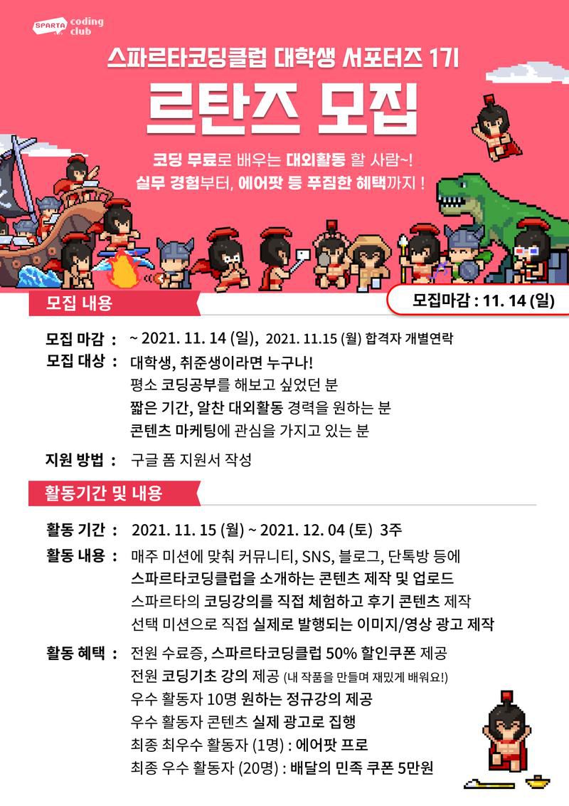 스파르타코딩클럽의 강의와 서비스를 재밌는 컨텐츠로 소개해줄 대학생 서포터즈, ‘르탄즈’를 모집합니다.