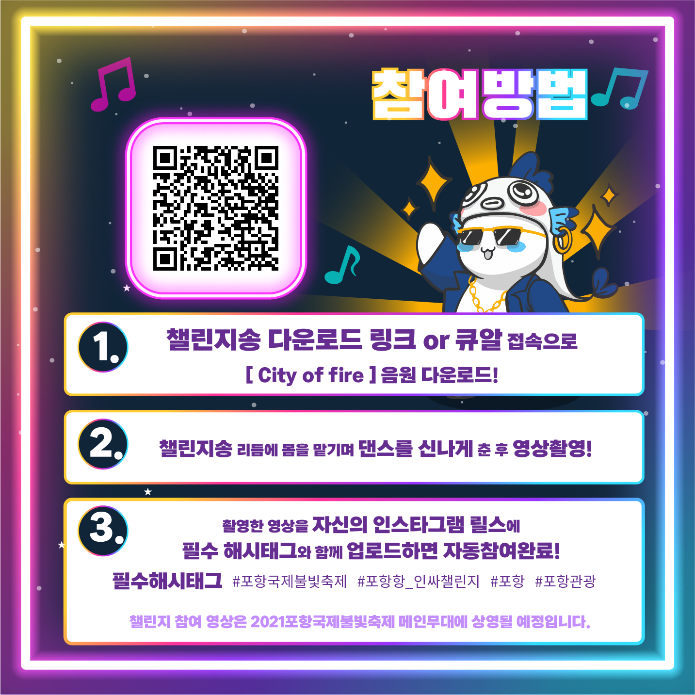 인스타그램 릴스에 필수 해시태그와 함께 업로드하면 자동 참여 완료이며, 챌린지 참여 영상은 2021포항국제불빛추제 메인무대에 상영될 예정입니다.