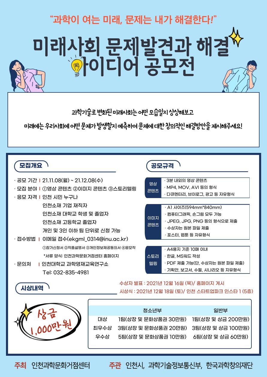 인천과학문화거점센터에서 ⌜미래사회 문제발견과 해결 아이디어 공모전⌟을 개최합니다.