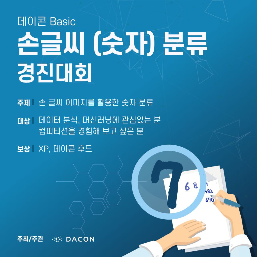 - 전 세계에서 가장 유명한 Computer Vision 분석 입문용 데이터인 MNIST 데이터를 통해 데이터 분석 대회에 입문해보세요.