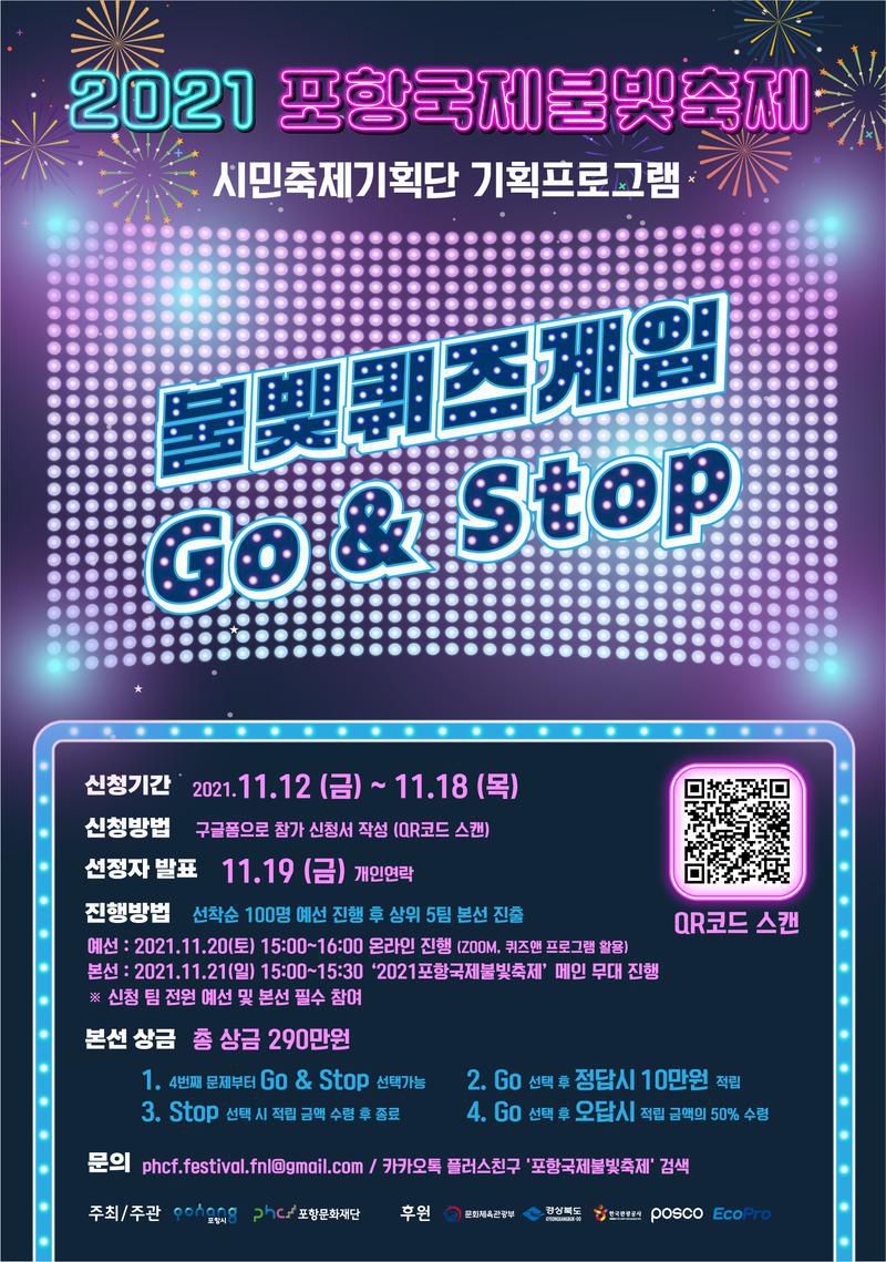 포항시와 포항문화재단이 개최하는 『2021포항국제불빛축제』에서 불빛퀴즈게임 Go & Stop 참가자를 모집합니다.