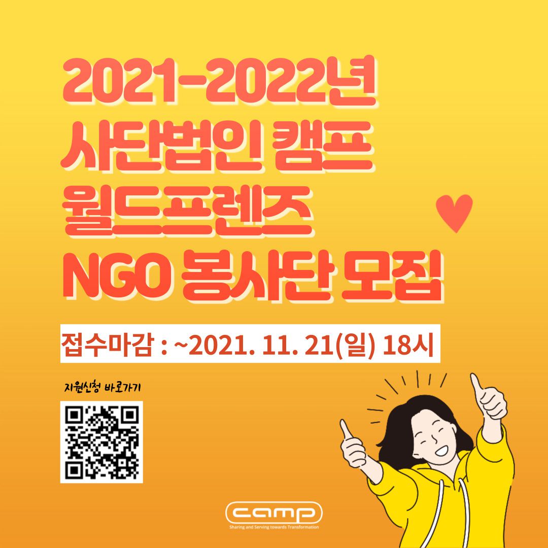 사단법인 캠프와 함께 필리핀의 타워빌, 마닐라, 딸락 지역에서 지역개발, 교육, 농림수산 분야의 사업에 참여하며 지속가능한 변화를 만들어나갈 2021-2022년 월드프렌즈 NGO봉사단을 모집합니다. 열정을 가지고 함께 할 역량있는 인재들의 많은 참여 바랍니다!!👏👏
