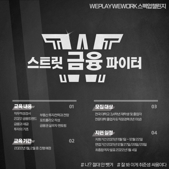 #금융#금융인#금융권취업#금융권#금융권대외활동#서포터즈#현장형#실무#실무교육#weplay#wework#weplaywework#지원하기#자소서특강#면접특강#대외활동