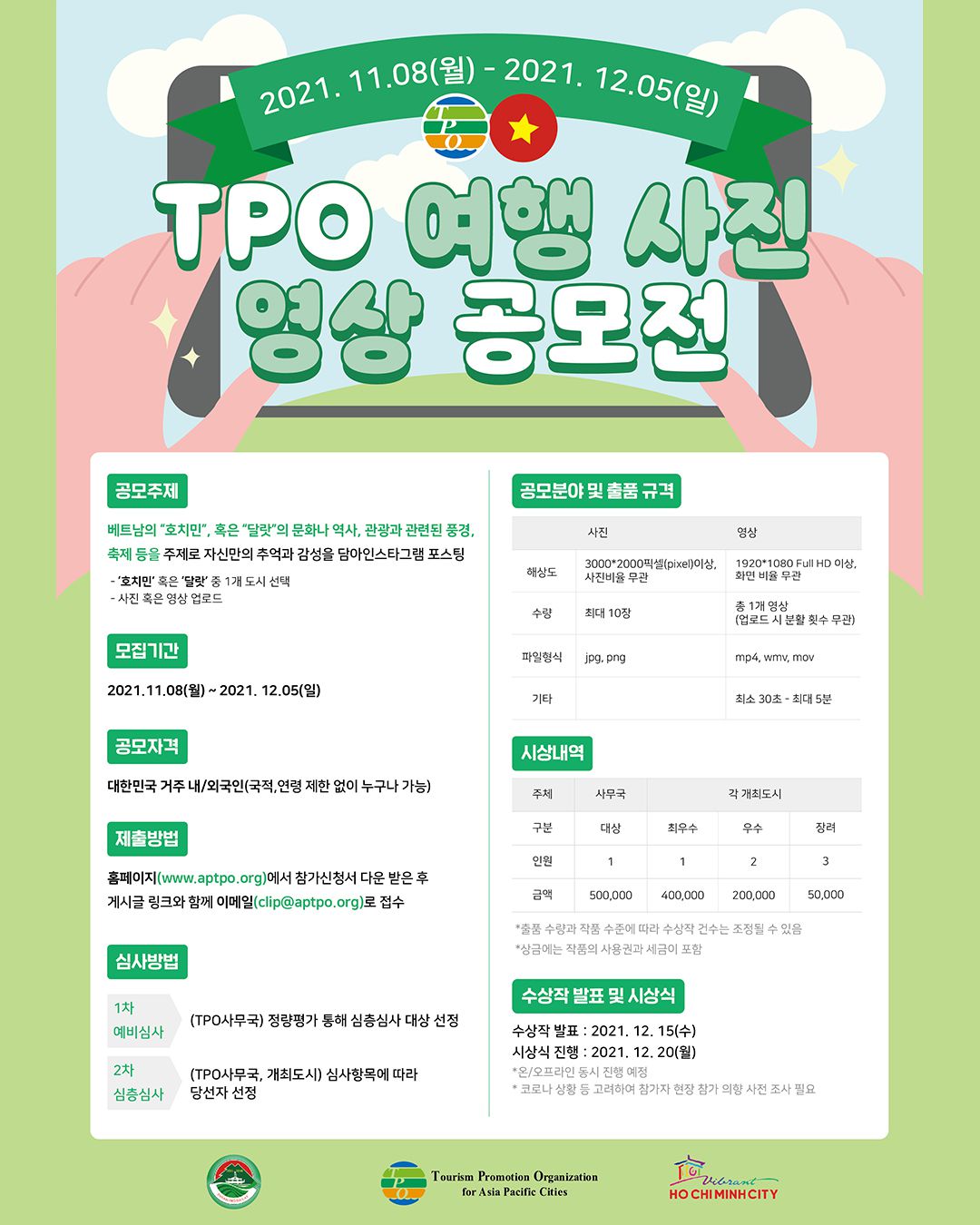 라. 수상작에 대한 저작권은 출품자(촬영자)에게 있으며, 주최 측(TPO 사 무국, 개최도시)은 행사 운영 및 홍보 등의 목적으로 수상작을 자유롭게 활용 (제작, 복제, 배포 등) 을 할 수 있고, 필요에 따라 수정하거나 변형해서 사용할 수 있음.