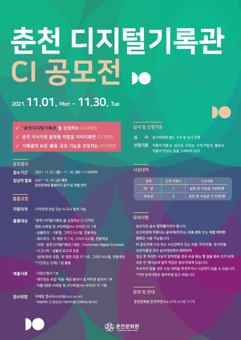 춘천문화원 춘천학연구소는 춘천과 관련한 다양한 기록물을 시민과 함께 널리 공유하고 후대에 안전하게 전달하기 위하여 디지털 지식자원 플랫폼 「춘천 디지털기록관」을 구축하여 2022년에 개통을 준비하고 있습니다. 이에 「춘천 디지털기록관」을 상징하는 CI 디자인 공모전을 개최하오니 아래의 내용을 참조하시어 응모해 주시기 바랍니다.