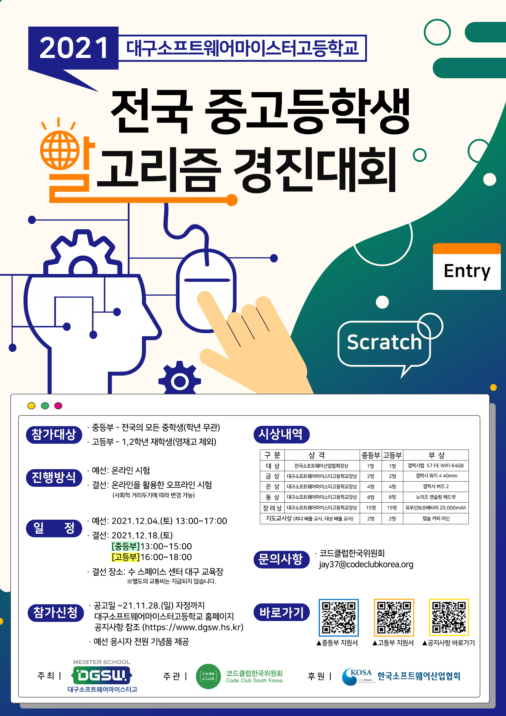 - 중등부: 주어진 문제를 해결하는 블록 코딩(스크래치, 엔트리 중 본인 선택)