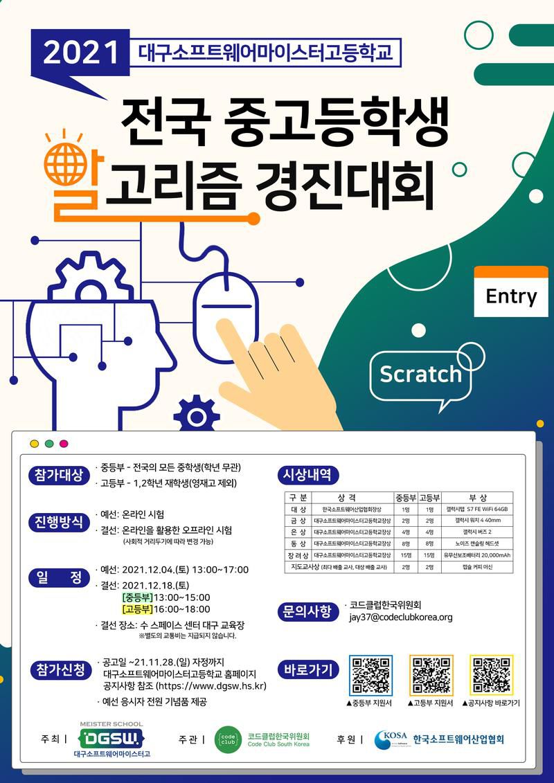 작년에 이어 올 겨울도, 대구소프트웨어마이스터고등학교와 함께 2021 전국 중고등학생 알고리즘 경진대회를 개최합니다.