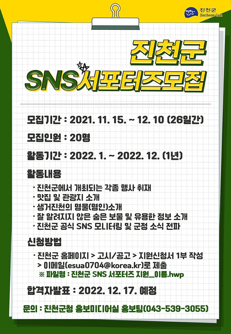 진천군의 문화, 관광, 축제, 향토음식 등 다양한 정보를 군민들에게 제공하고 진천군 SNS의 활성화를 도모하고자 참신함과 책임감을 갖고 활동해주실 진천군 SNS 서포터즈를 모집하오니 많은 참여 바랍니다.