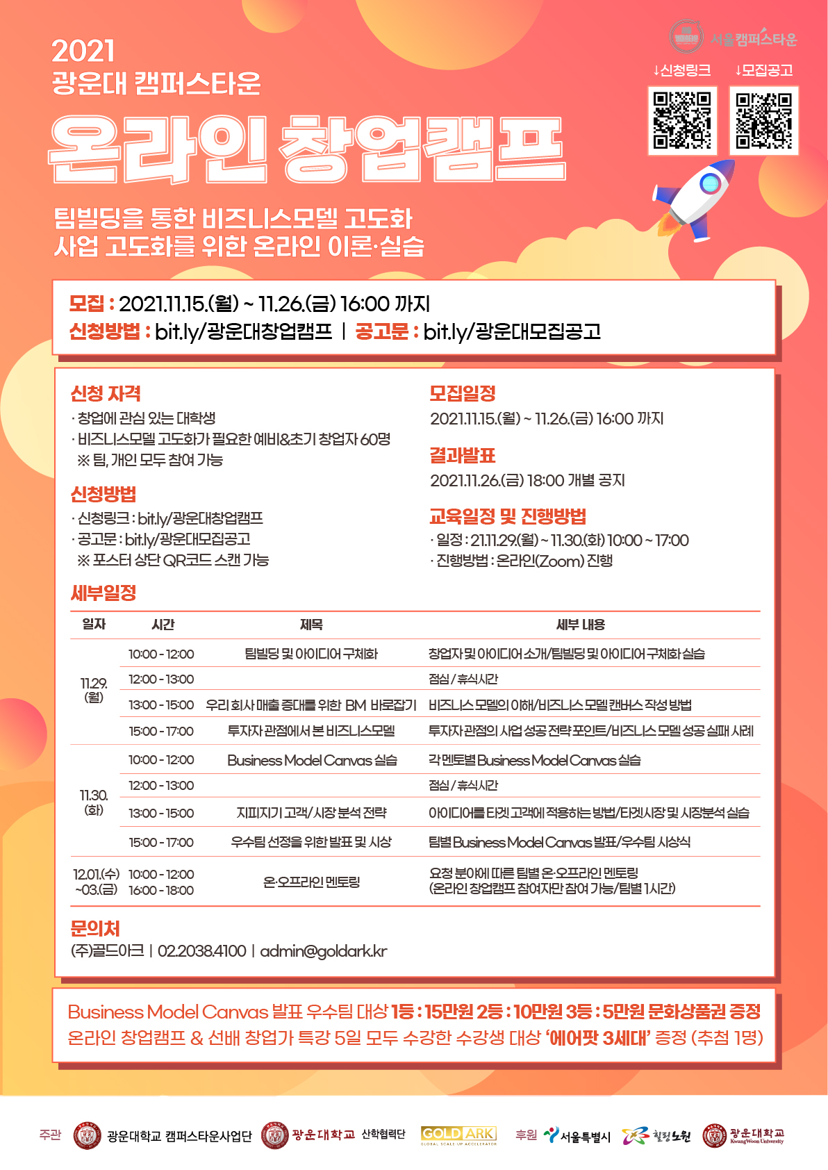 - 광운대학교 학생 및 (예비)창업자들을 대상으로 비즈니스 모델, 사업고도화를 위한 온라인 이론 및 실습 프로그램 제공