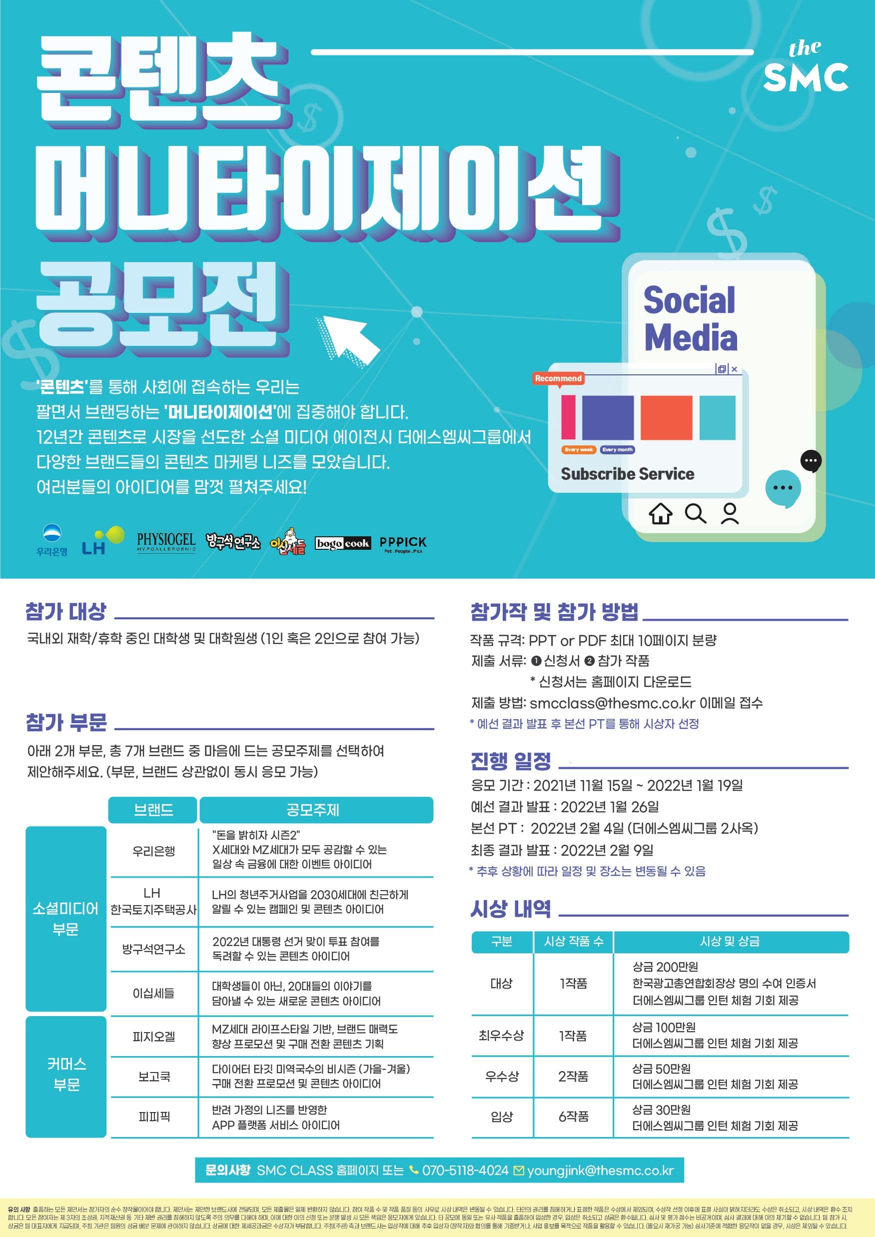 입상(6작품): 상금 30만원 / 더에스엠씨그룹 인턴 체험 기회 제공