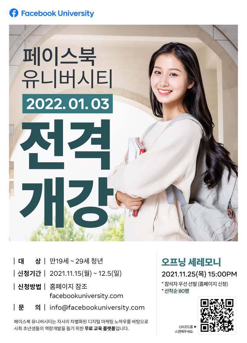 · 1단계 - 온라인 지원(www.facebookuniversity.com) : 2021.11.15.(월) ~12.5.(일)