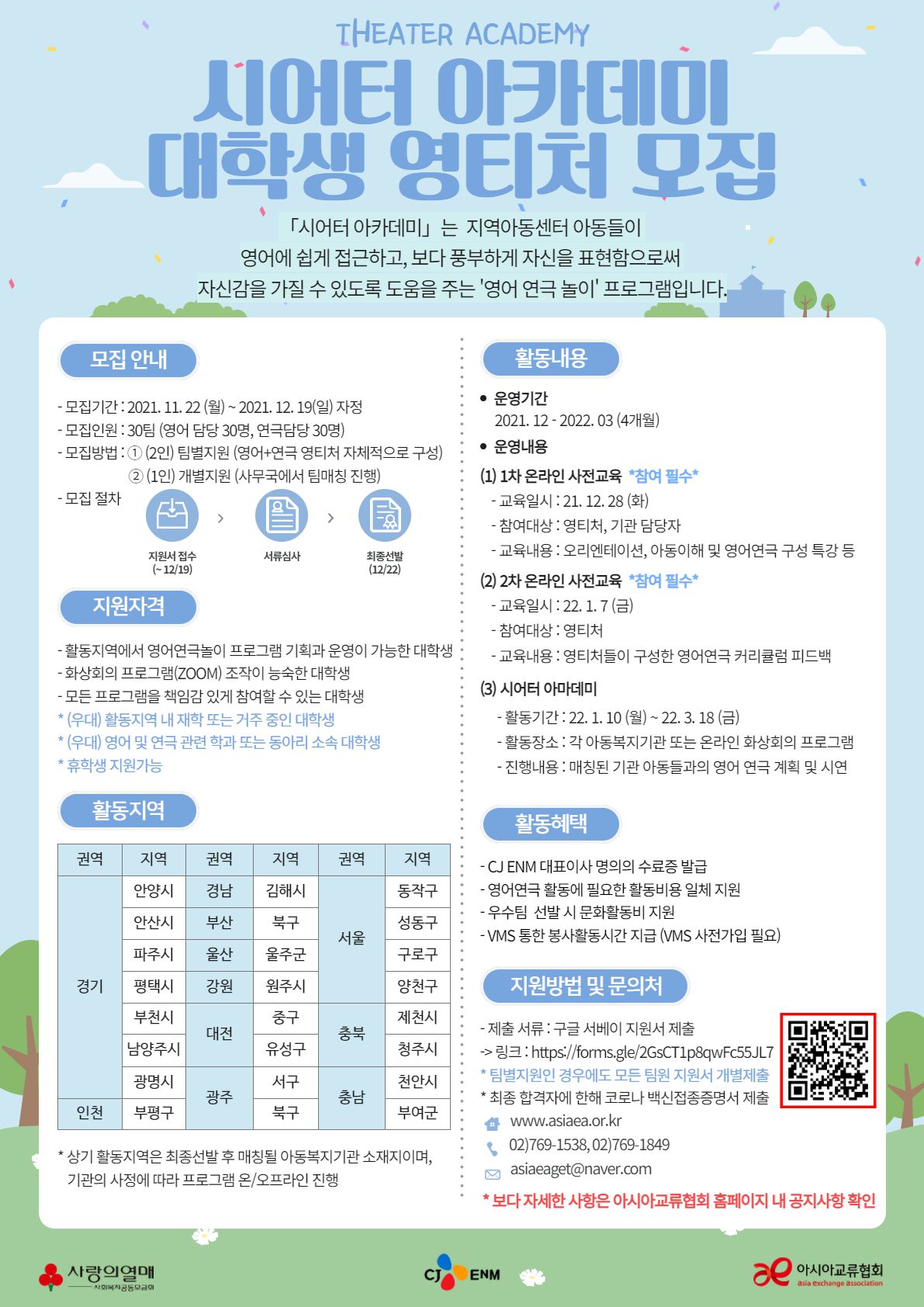영어연극을 기획하고 시연하여, 아동들의 잠재력을 끌어내줄 대학생 봉사자분들을 모집하오니 아동에 대한 관심과 노하우가 있는 대학생 여러분의 많은 지원 바랍니다! 😊