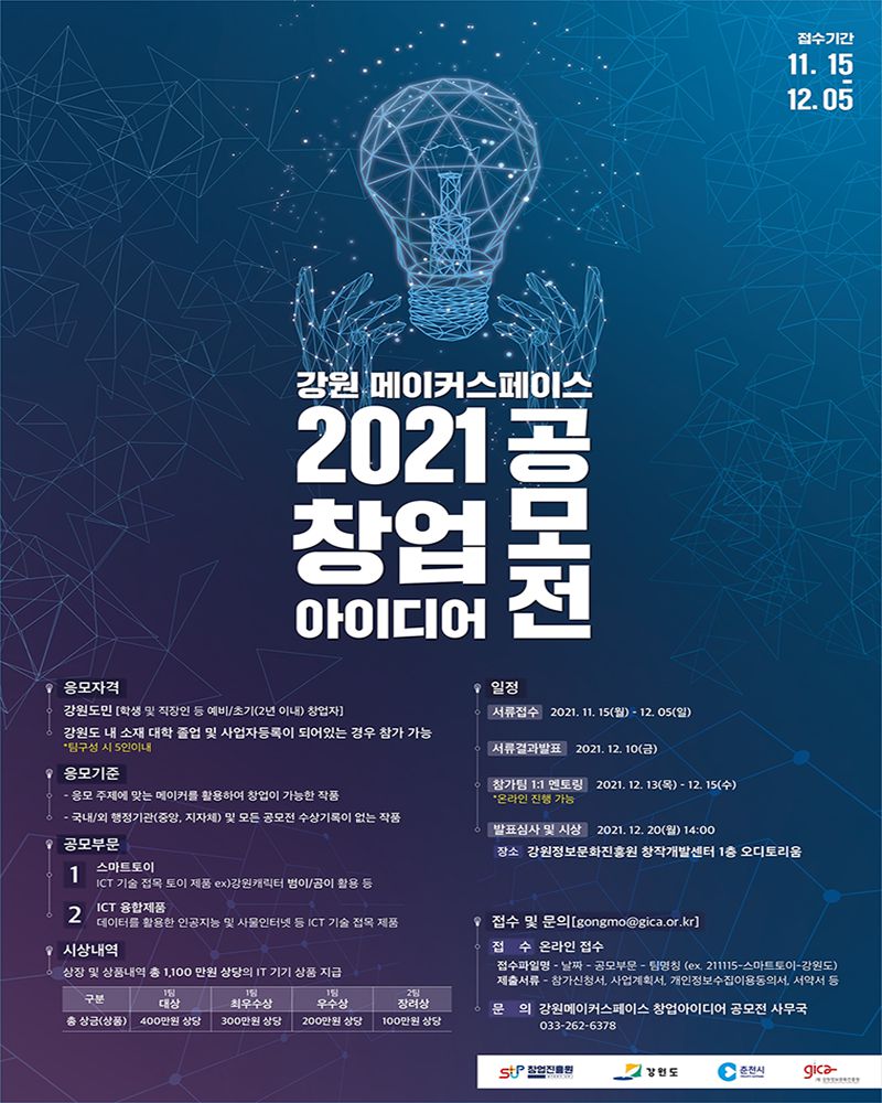 - ☎강원메이커스페이스 창업아이디어 공모전 사무국 033-262-6378