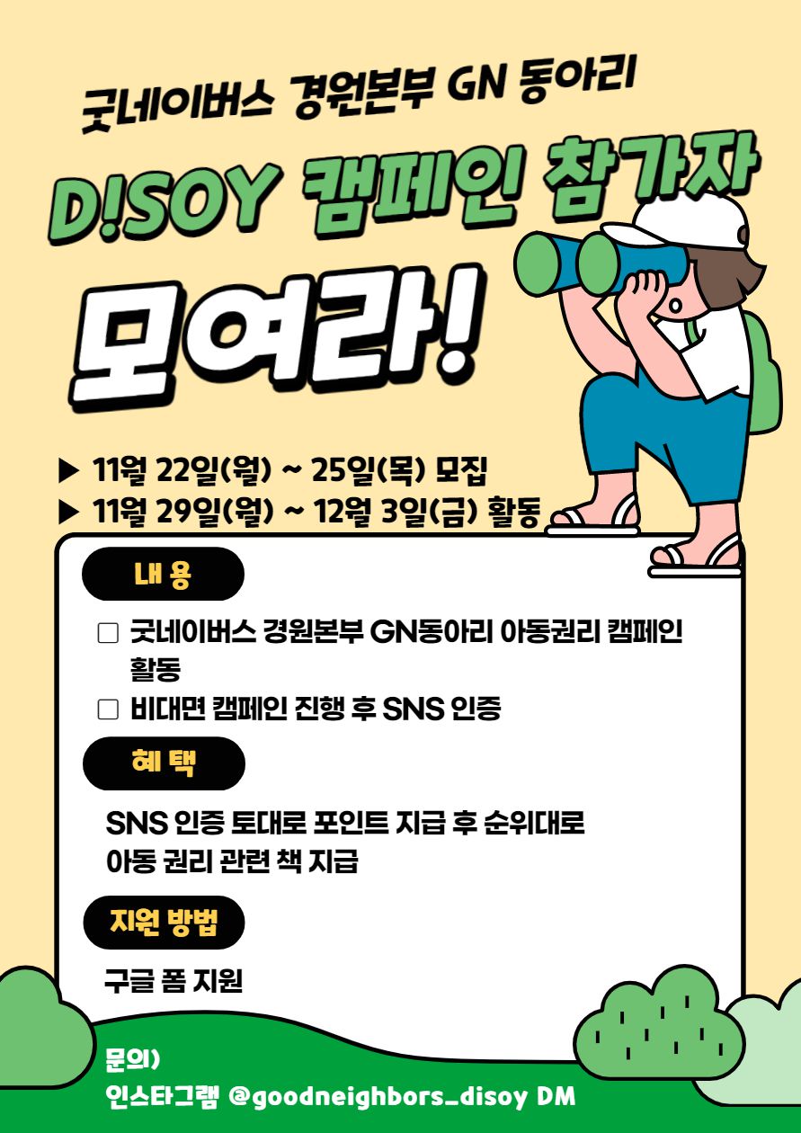 안녕하세요! 굿네이버스 경원본부 GN 동아리에서 D!SOY (Dush! Step Of Youth) 캠페인 참가자를 모집합니다.