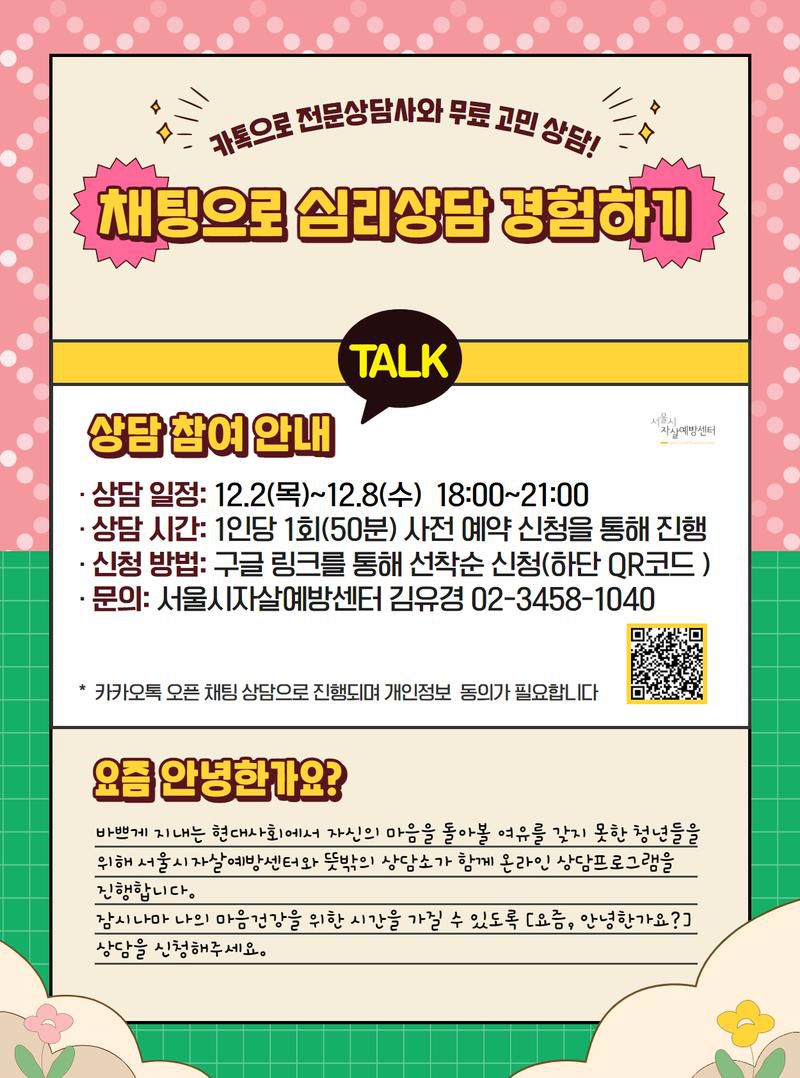 요즘 안녕한가요? 바쁘게 지내는 현대사회에서 자신의 마음을 돌아볼 여유를 갖지 못한 청년들을 위해 서울시자살예방센터와 뜻밖의 상담소가 함께 온라인 상담프로그램을 진행합니다.
