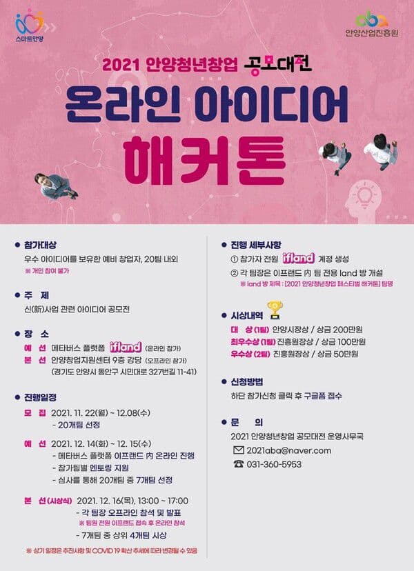 □ 문의 : 2021 안양청년창업 공모대전 운영사무국 (E. 2021aba@naver.com / T.031-360-5953)
