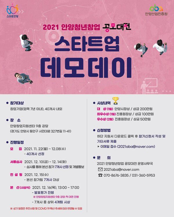 □ 문의 : 2021 안양청년창업 공모대전 운영사무국 (E. 2021aba@naver.com, T. 070-8676-3835 / 031-360-5953)