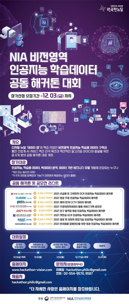 - 디지털 뉴딜 '데이터 댐'의 핵심 사업인 비전영역 인공지능 학습용 데이터 구축을 통한 산업계 AI 서비스 혁신 인식 확산과 혁신적인 알고리즘 아이디어 발굴을 위한 공동 해커톤 대회