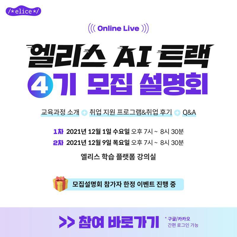 모집설명회 참여자 한정 지원 이벤트가 진행됩니다. 개발자 취업 교육과정, 혹은 엘리스 AI 트랙에 관심이 있다면 모집 설명회에 참여하세요!