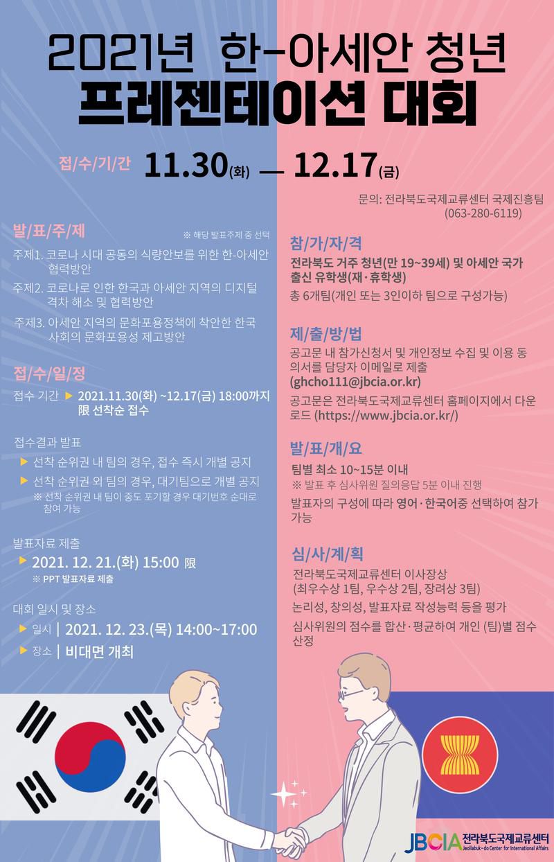 전라북도국제교류센터에서는 아세안 지역 유학생과 전라북도 청년간 상호지역 이해도 향상으로 지역간 우호관계 증진 및 장기적 청년 교류기반을 형성하기 위한「2021년 한-아세안 청년 프레젠테이션 대회」참가자를 모집하오니 많은 관심과 참여 바랍니다!
