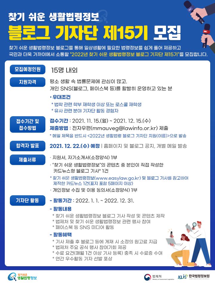"2022년 찾기 쉬운 생활법령정보 블로그 기자단 제15기"를 모집합니다.