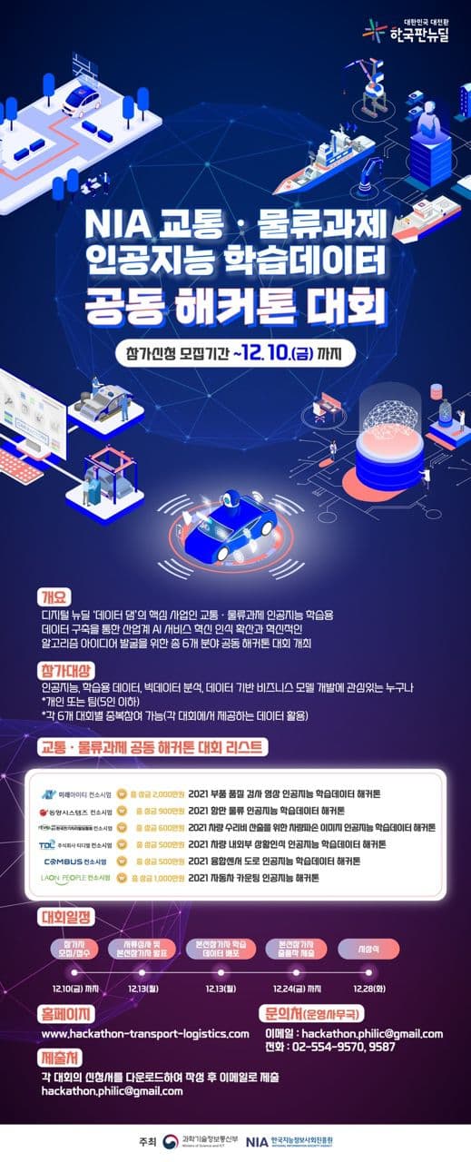 - 디지털 뉴딜 '데이터 댐'의 핵심 사업인 교통·물류과제 인공지능 학습용 데이터 구축을 통한 산업계 AI 서비스 혁신 인식 확산과 혁신적인 알고리즘 아이디어 발굴을 위한 공동 해커톤 대회