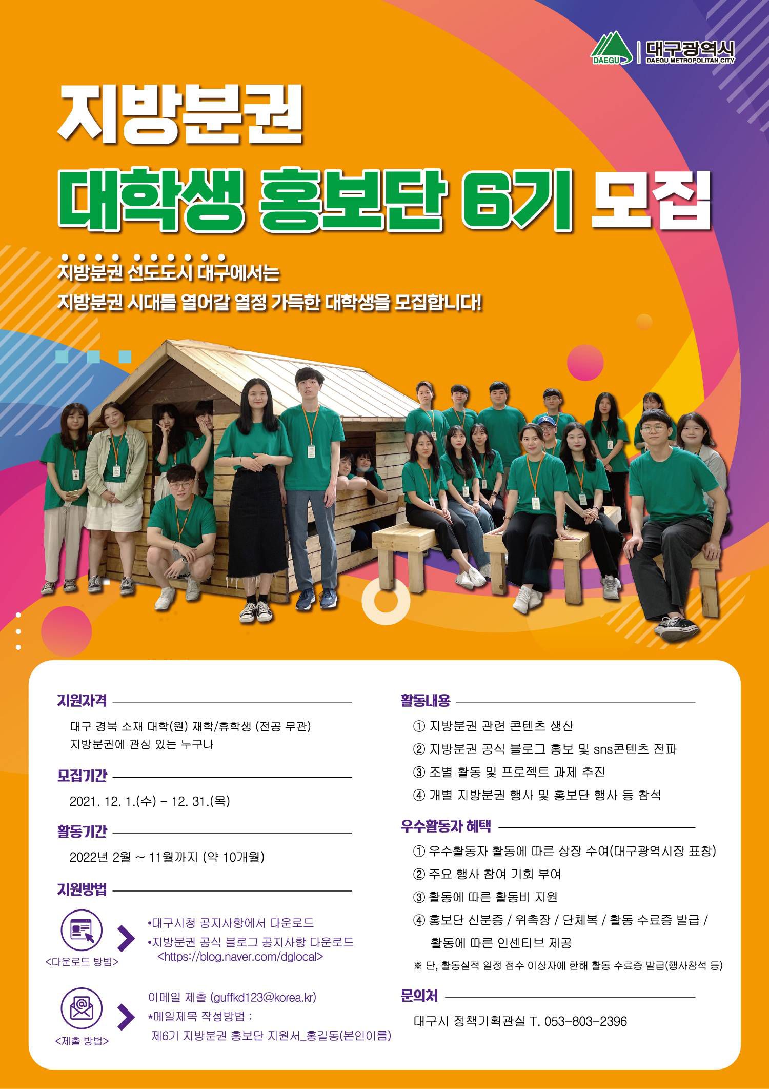 「제6기 대구시 지방분권 대학생 홍보단」을 아래와 같이 모집합니다.