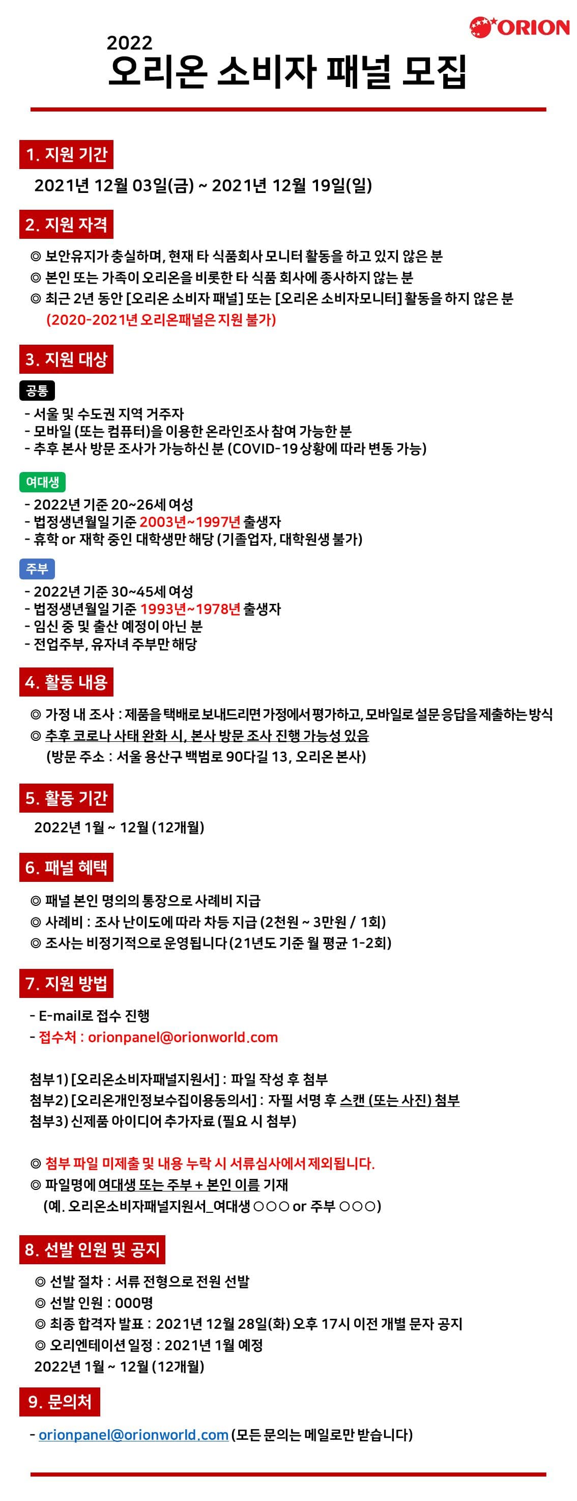 - 파일명에 여대생 또는 주부 + 본인 이름 기재 (예. 오리온소비자패널지원서_여대생 ○○○ or 주부 ○○○)