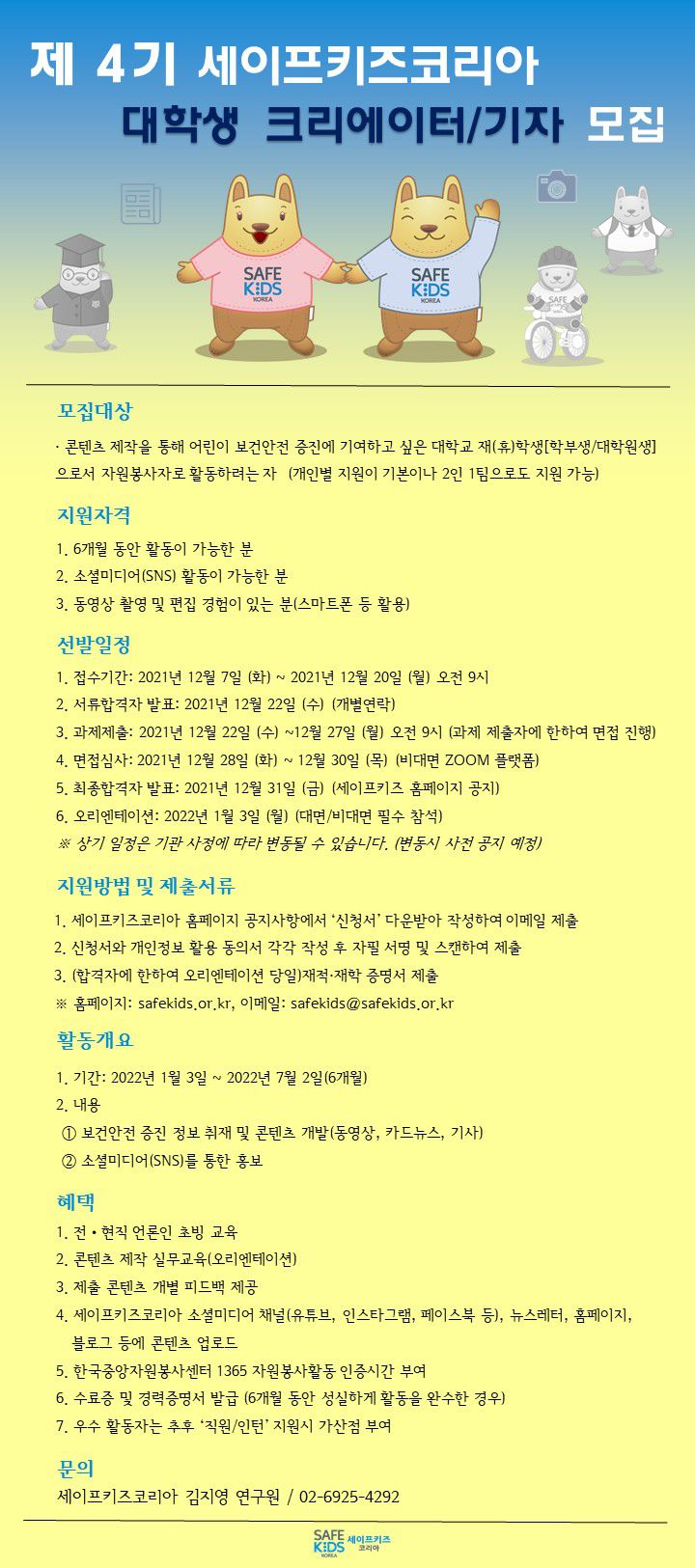 4기 세이프키즈코리아 대학생 크리에이터/기자 모집