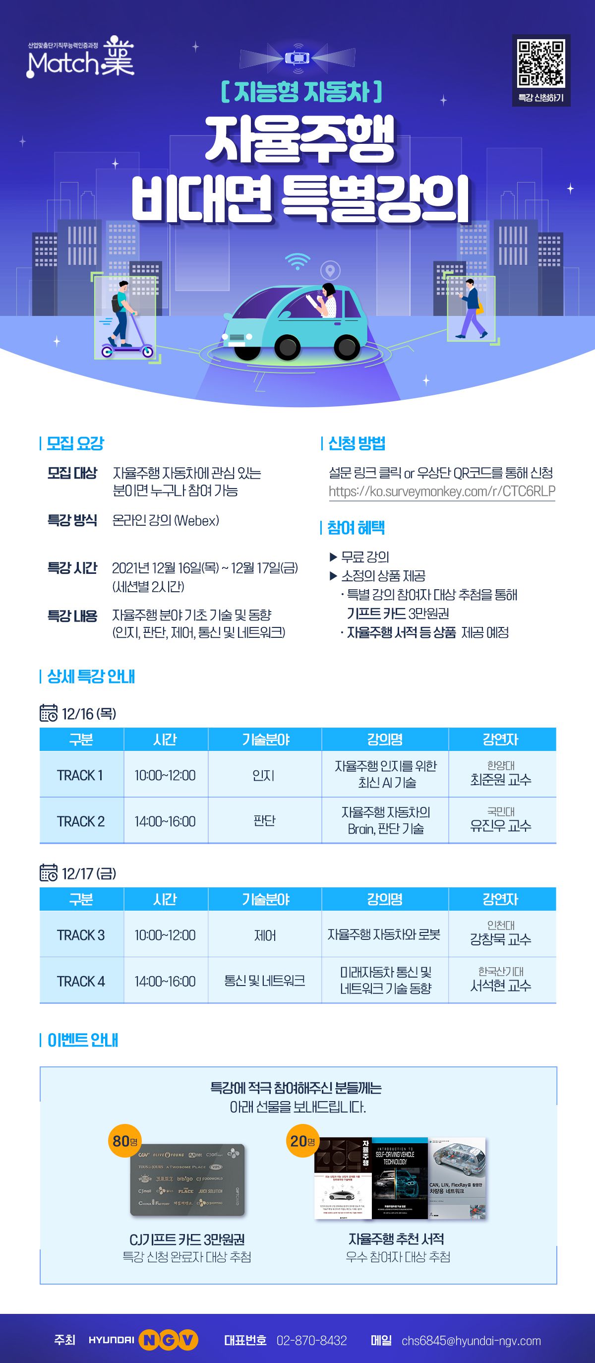 *참여 혜택: 추첨을 통해 특강 신청 완료자 대상에게는 CJ기프트 카드 3만원권(80명), 우수 참여자 대상에게는 자율주행 추천 서적(20명) 등 풍성한 경품 제공