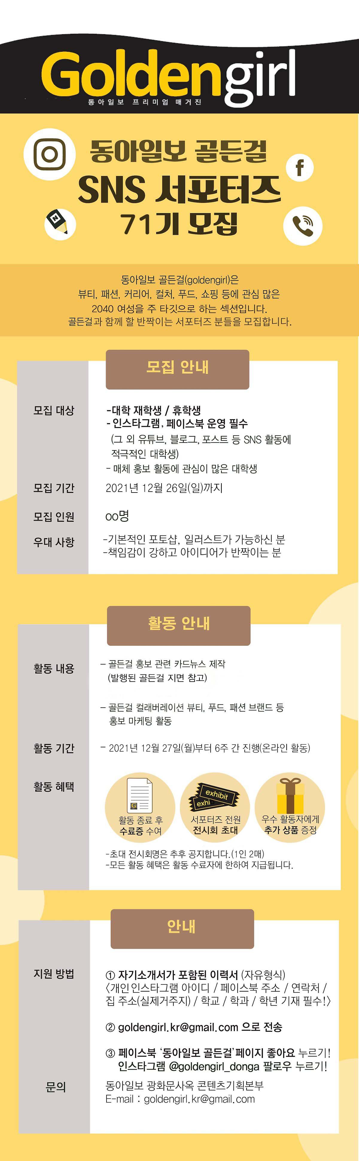 동아일보 프리미엄 섹션 '골든걸' 에서 대학생 서포터즈 '71기' 를 모집합니다.