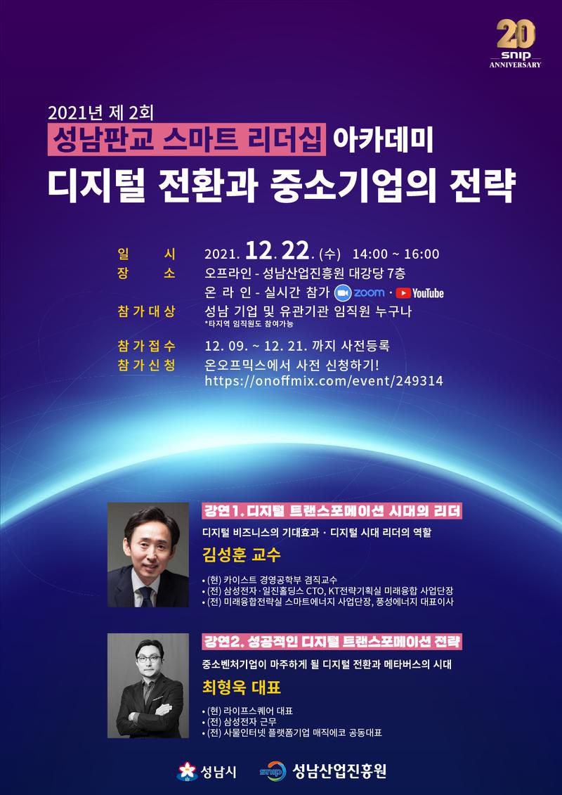 안녕하세요. 성남산업진흥원이 2021년 제2회 성남판교 스마트리더십 아카데미를 개최합니다.