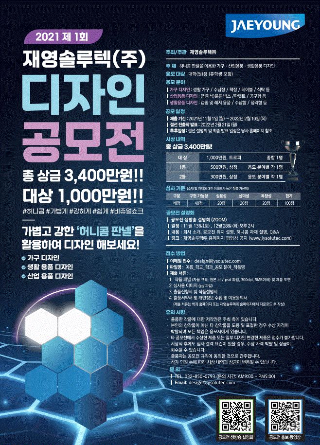 자세한 공모전 설명은 당사 유튜브 채널(https://www.youtube.com/channel/UCCx5V7QwhiUwyb1cFeRXgDA) 또는 홈페이지(Design 탭)에서 확인 바랍니다.