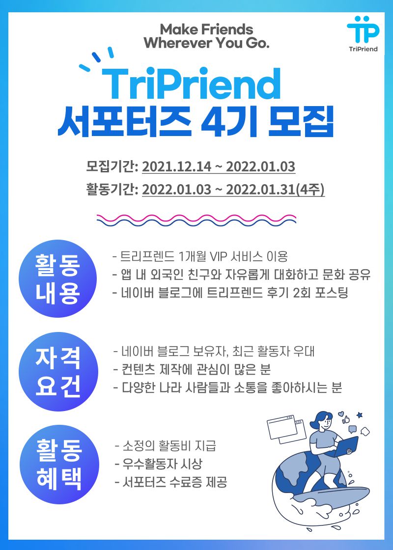 4주 간의 활동 동안 다양한 사람들과 소통하며 재미있는 주제로 주어진 콘텐츠를 제작하며 트리프렌드를 홍보하실 분들을 모집합니다! 👏