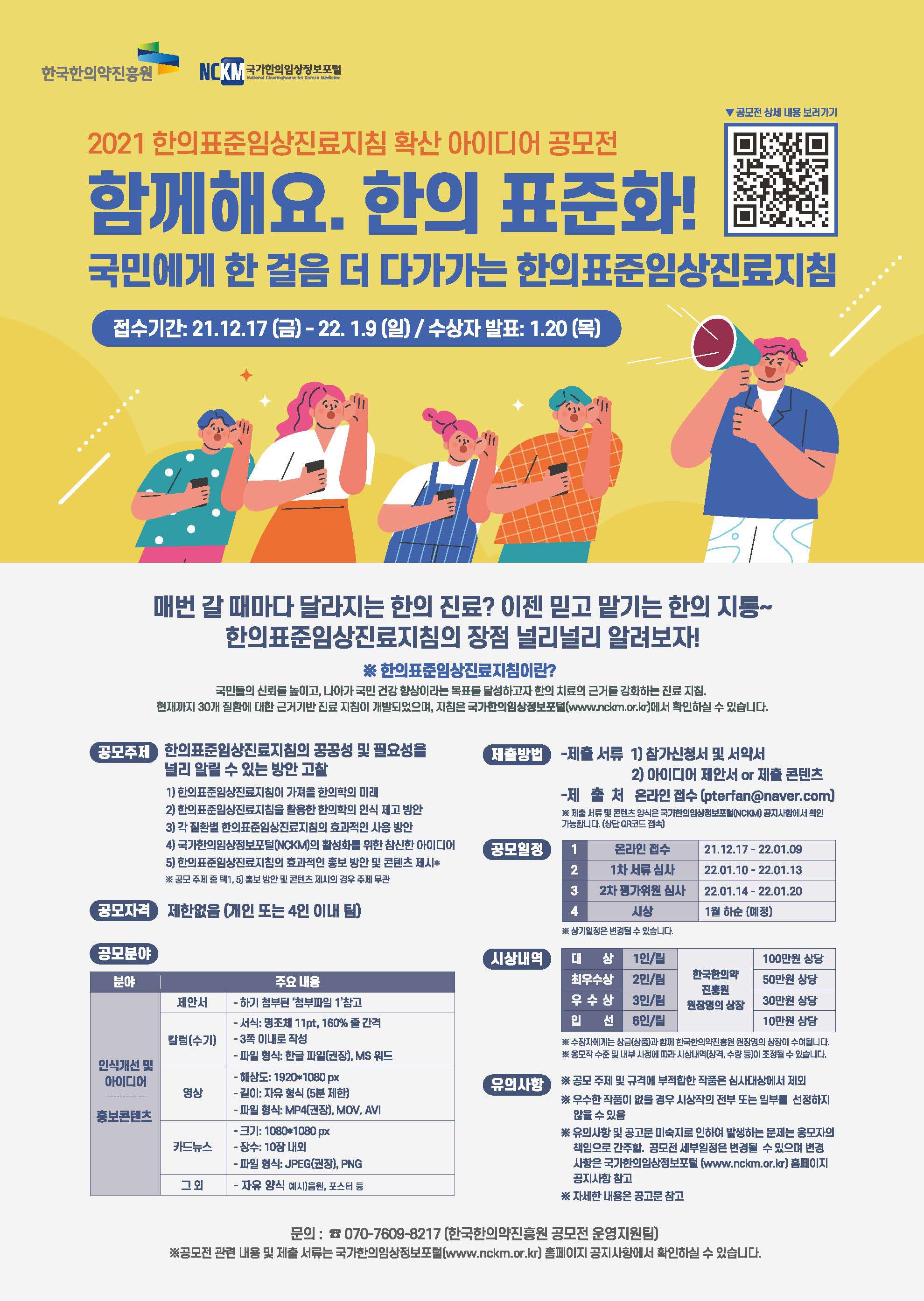 ※ 문의사항은 070-7609-8217 (한국한의약진흥원 공모전 운영지원팀)으로 부탁드립니다.