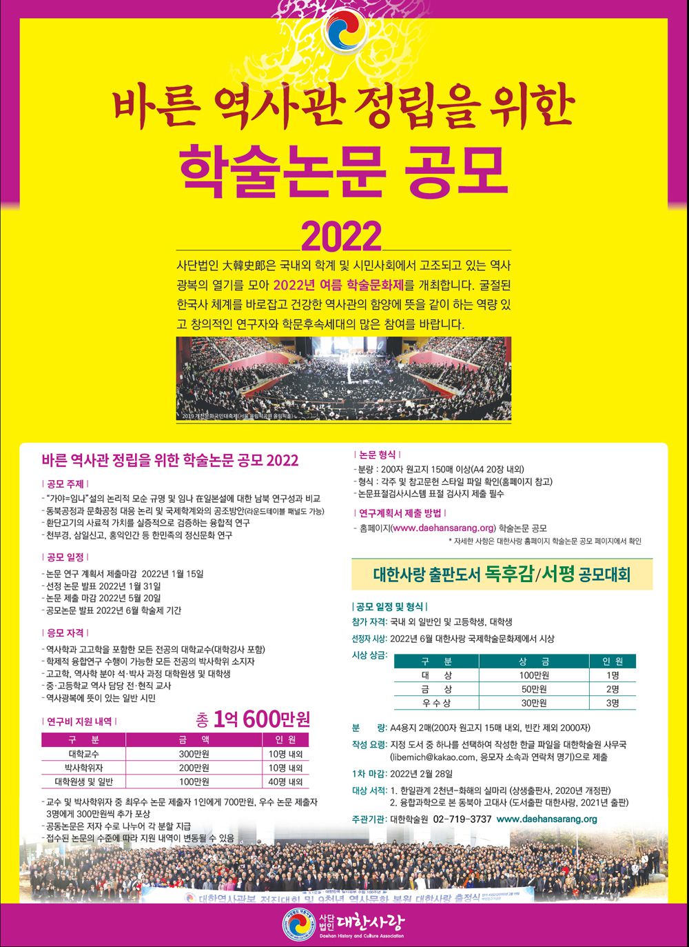 2022년 사단법인 대한사랑은 국내외 하계 및 시민사회에서 고조되고 있는 역사 광복의 열기를 모아 2022년 여름 학술문화제를 개최합니다.