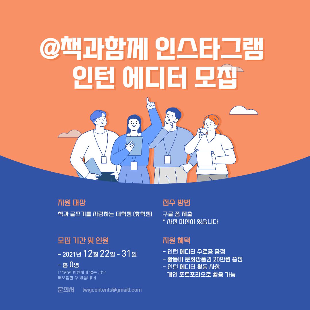 책을 좋아하는 사람들이 모여 만든 북크리에이터 그룹 <책과함께>의 공식 인스타그램 계정 인턴 에디터를 모집합니다.