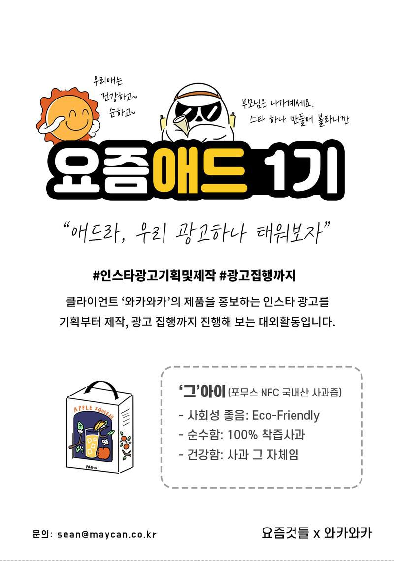 요즘것들과 애드(Ad)의 합성어로. 트렌디한 감각을 가진 여러분 스스로가 광고기획사가 되어, 광고주가 의뢰한 제품의 인스타 광고 콘텐츠를 직접 기획 및 제작하고, 광고까지 집행해 보는 활동입니다.