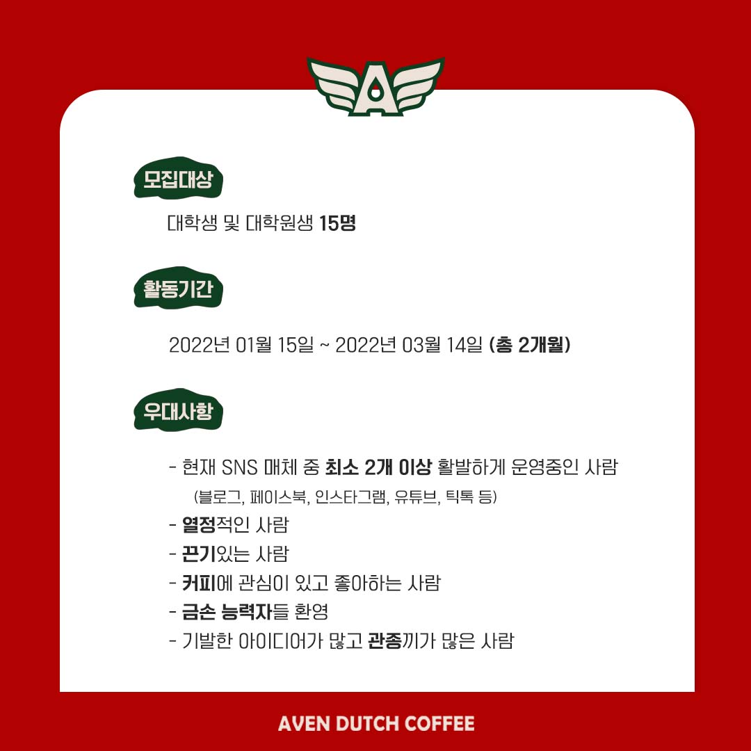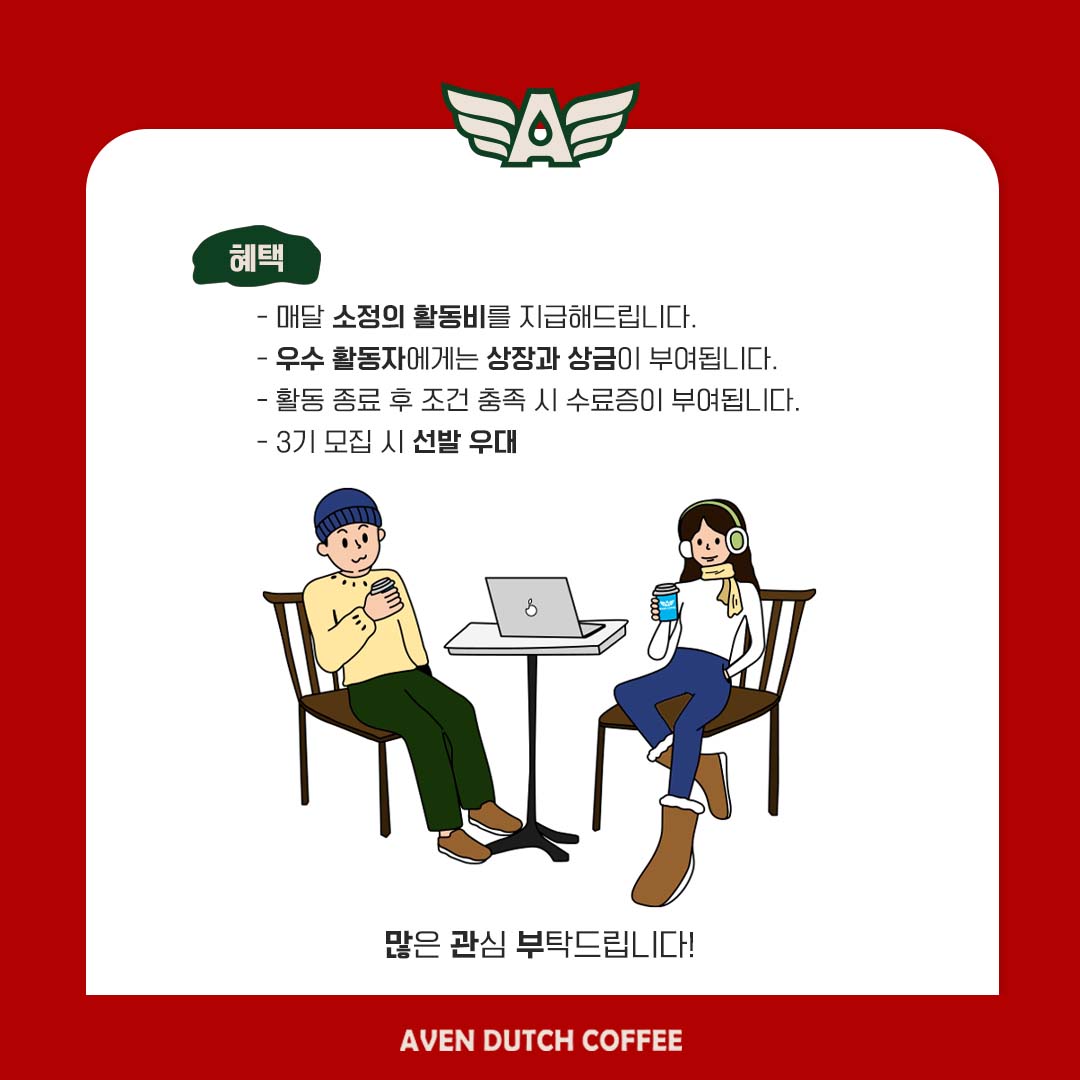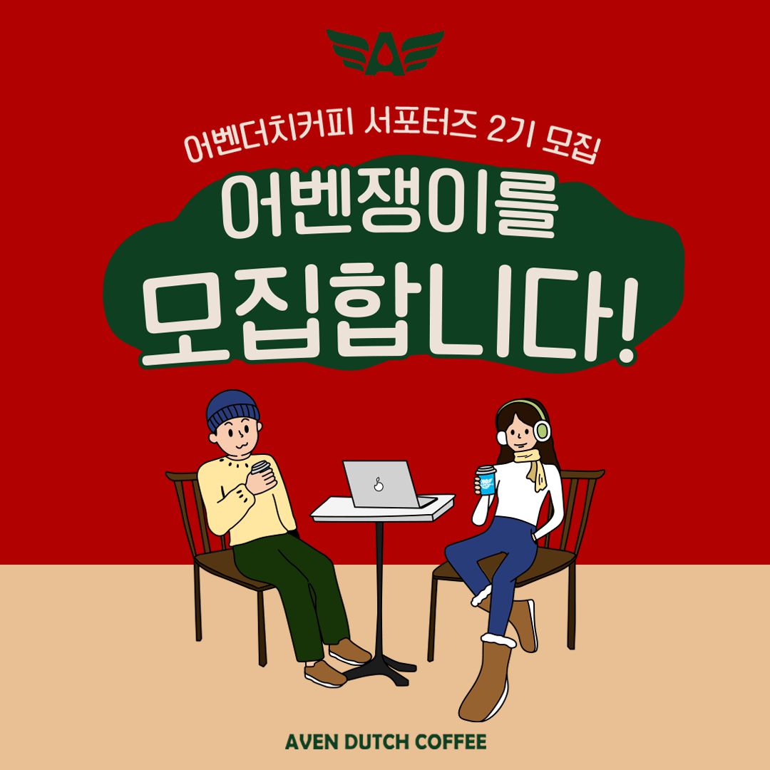 - 제작한 카드뉴스, 이미지 등의 콘텐츠 저작권은 서포터즈 본인에게 귀속되나, 어벤더치커피 SNS 채널에 게시되거나 2차 사용될 수 있습니다.