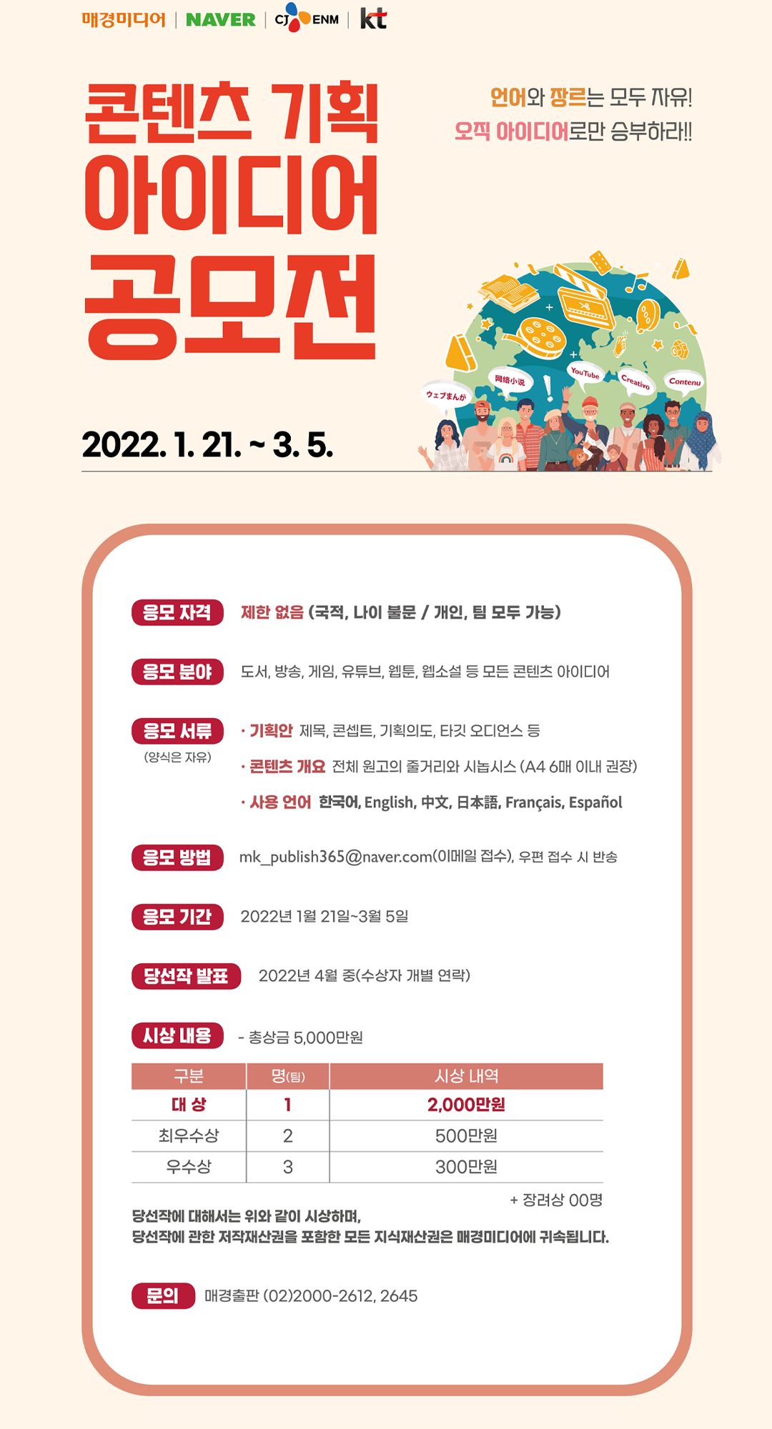 K콘텐츠가 저력을 발휘하고 있는 것이 이런 환경 덕분이기도 합니다. 매경출판은 도서 예능 드라마 유튜브 웹툰 웹소설 등 장르를 따지지 않고 ‘밀리언셀러’급 콘텐츠 아이디어를 대대적인 ‘열린 공모’를 통해 구하고자 합니다.