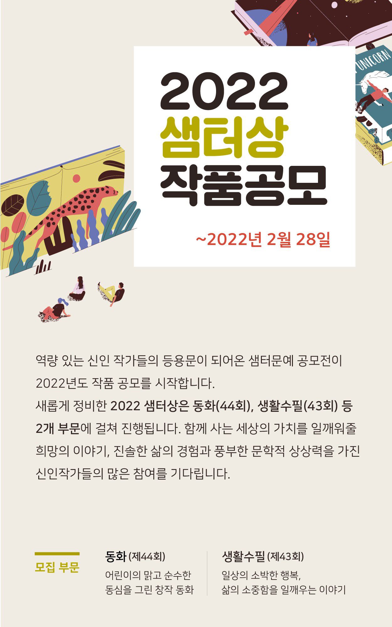 응모부문 및 주제를 새롭게 정비한 2022 샘터문예 공모전은 동화(44회), 생활수필(43회) 등 2개 부문에 걸쳐 진행됩니다. 함께 사는 세상의 가치를 일깨워줄 희망의 이야기, 진솔한 삶의 경험과 풍부한 문학적 상상력을 가진 신인작가들의 많은 참여를 기다립니다.