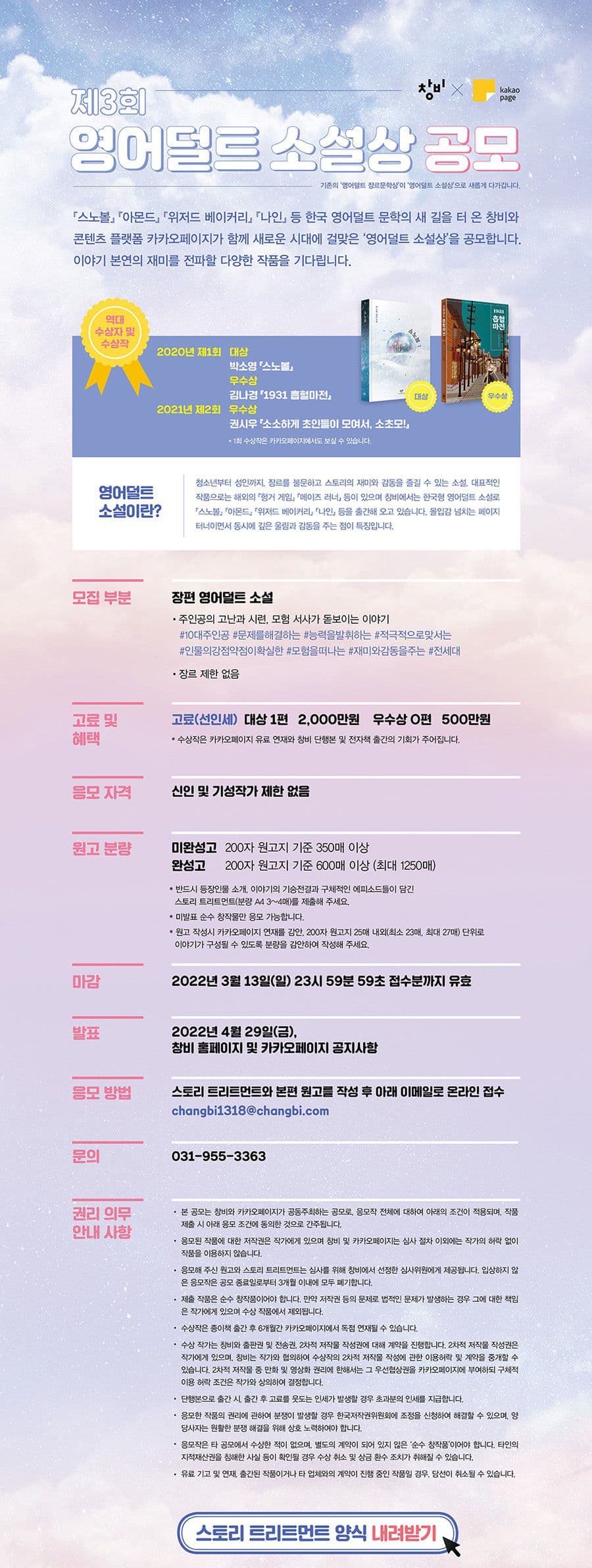 『스노볼』, 『아몬드』, 『위저드 베이커리』, 『나인』 등 한국 영어덜트 문학의 새 길을 터 온 창비와 콘텐츠 플랫폼 카카오페이지가 함께 새로운 시대에 걸맞은 ‘영어덜트 소설상’을 공모합니다. 이야기의 본연의 재미를 전파할 다양한 작품을 기다립니다.