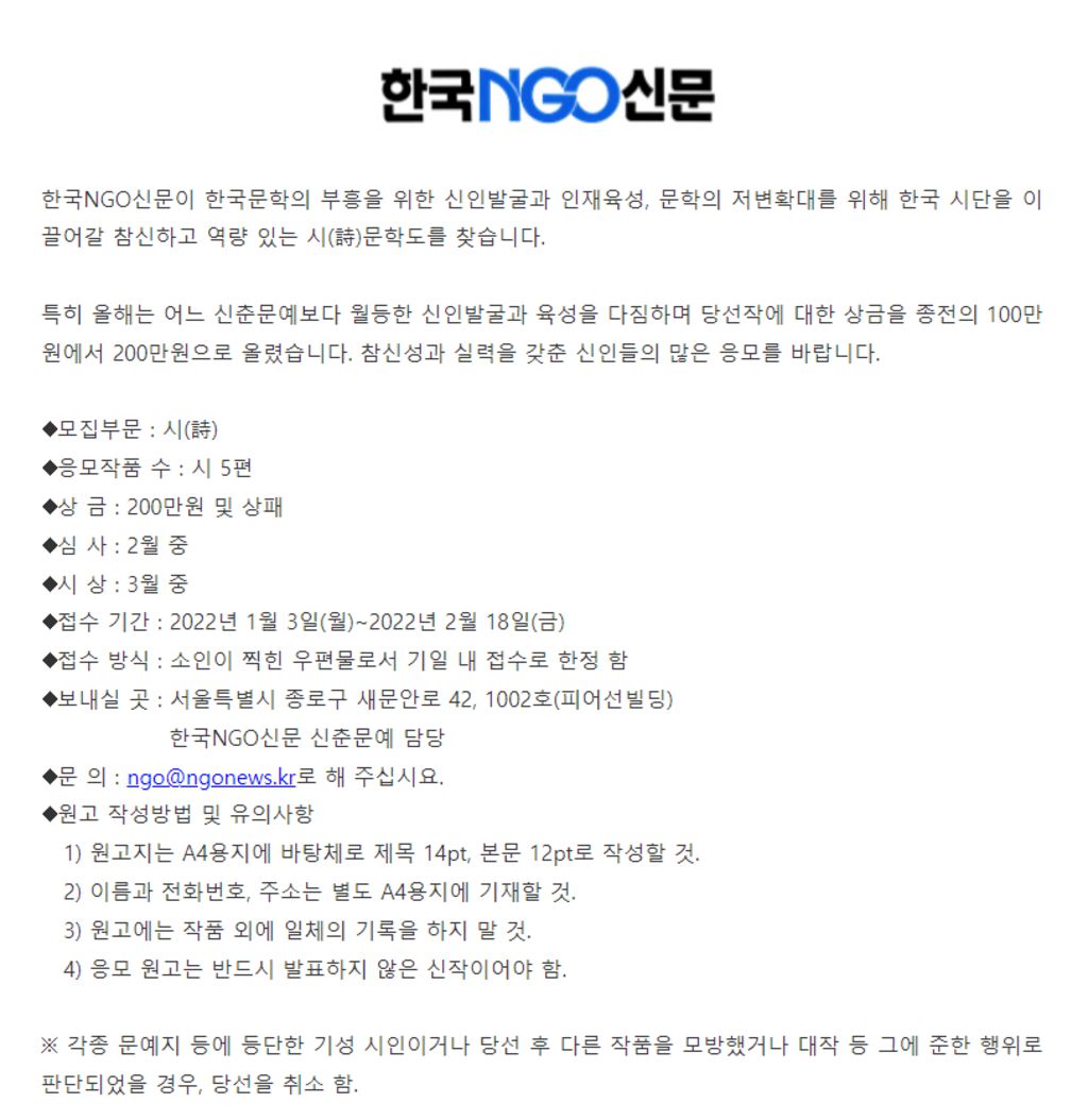[2022 한국NGO신문 제6회 신춘문예 대상 시 공모]