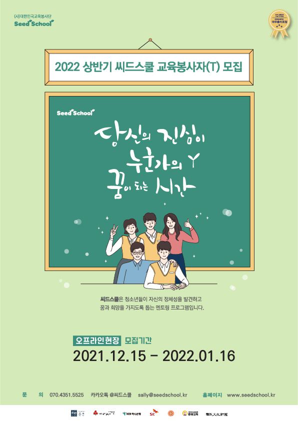 2022년 상반기 청소년 멘토링 프로그램 '씨드스쿨' 오프라인 교육봉사자(T) 모집