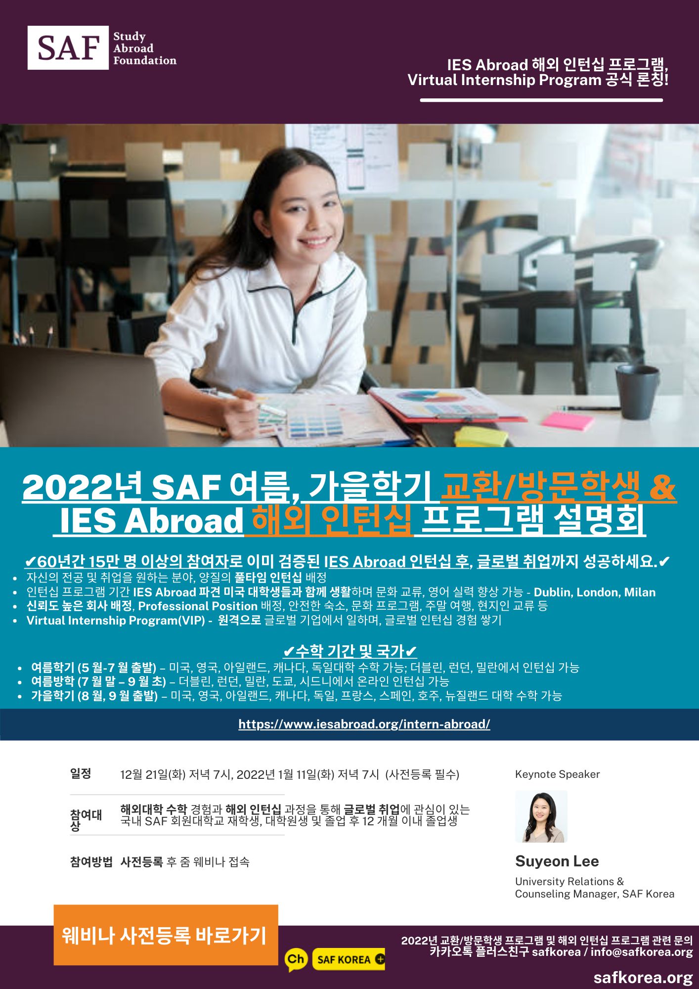 IES Abroad Internship Program 한국 공식 런칭 소식을 알려드리며, 내년 여름학기/가을학기 방문교환학생 안내와 더불어 웨비나를 개최할 예정입니다!지금 바로 아래 사진의 웨비나 프로그램 사전신청 버튼을 클릭하고, 2022년 여름, 가을학기 SAF 교환, 방문, IES Abroad 해외 인턴십 프로그램 설명회 사전신청 등록하세요!