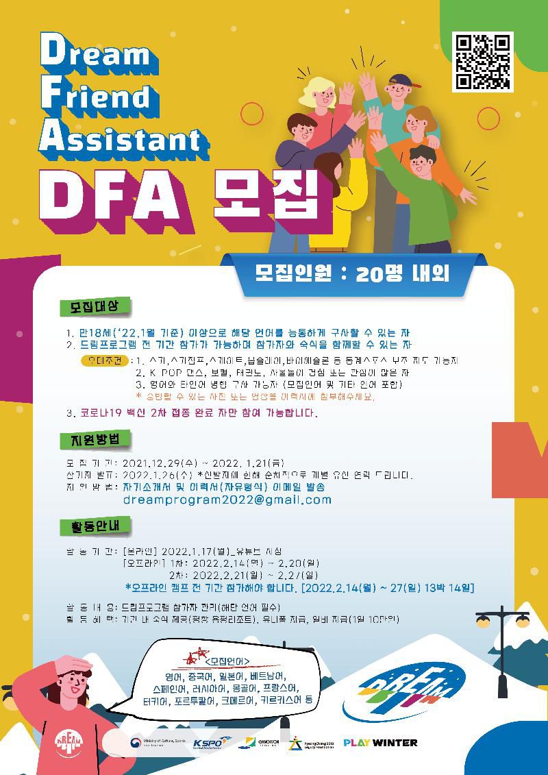 DFA는 Dream/Friend/Assistant의 약자로 드림프로그램 기간 동안 외국인 참가자들과 함께 활동하며 관리하는 친구들을 말합니다(해당 언어 필수).