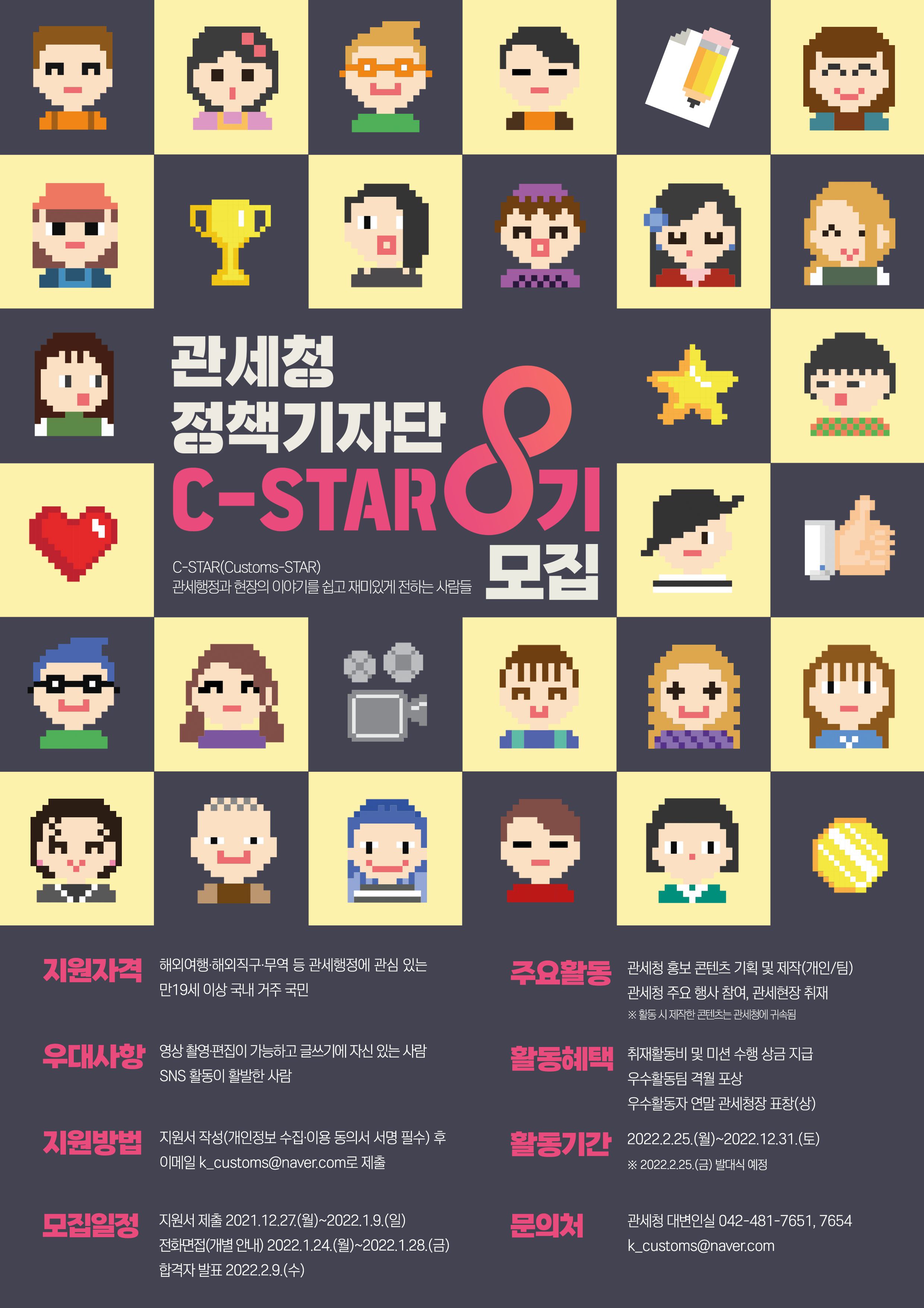 대한민국 관세국경의 수호자인 관세청에서 생생한 관세 현장의 소식과 관세 정책을 쉽고 재미있게 전할 사람들인 C-STAR 8기를 모집합니다.