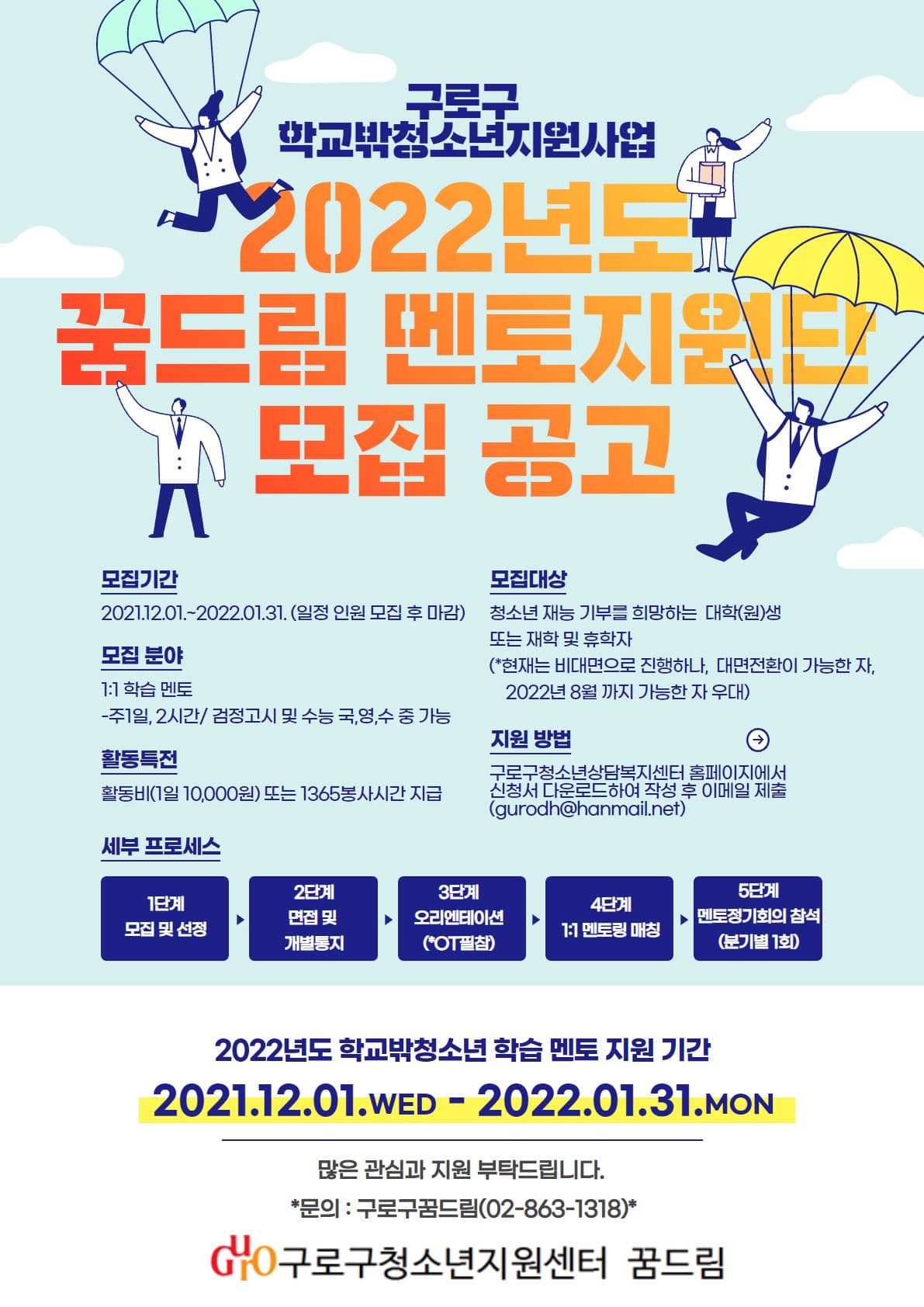 -안녕하세요. 구로구청소년지원센터 꿈드림은 학교 밖 청소년 지원에 관한 법률에 의거하여 청소년들에 대한 상담지원, 교육지원, 직업체험 및 취업지원, 자립지원 등 역할을 수행함으로써 학교 밖 청소년이 건강한 사회구성원으로 성장할 수 있도록 지원하고 있습니다. 다음과 같이 "구로구 꿈드림 1:1 학습 멘토" 를 모집하고자 하오니, 많은 관심과 참여 부탁드립니다! 감사합니다 ♥