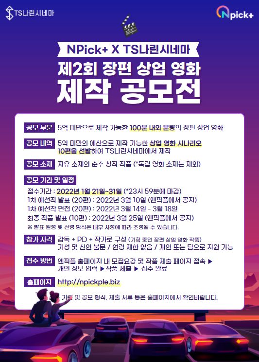 5억 미만의 예산으로 제작 가능한 상업영화 시나리오 10편을 선발하여 TS나린시네마에서 제작
